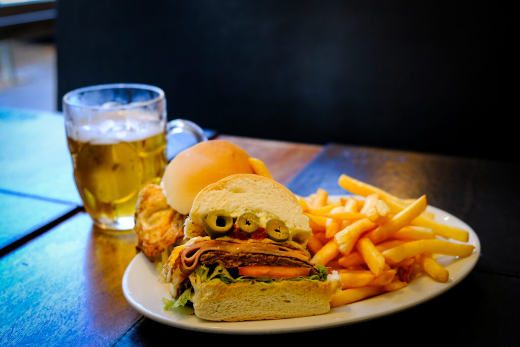 The Chivito is Uruguay’s national sandwich – a culinary monstrosity of thinly sliced steak, fried egg, ham, mozzarella, bacon, olives, tomato and mayonnaise, all compressed into a struggling bread roll. All the major food groups are represented. After my parrilla adventures earlier, I decided to just order the mini version hoping for a lighter meal, but that was to no avail.